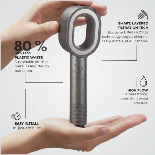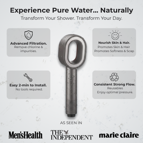 Why it matters: chlorine strips natural oils; metals cause build-up & irritation; filtered water helps your routine perform as intended.